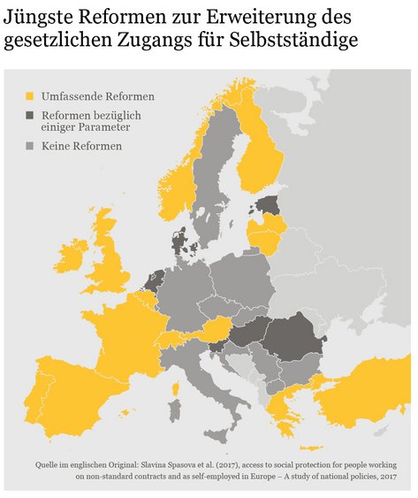 Für die Gewährleistung eines angemessenen Zugangs zum Sozialschutz für Selbstständige erfolgt die Anpassung in der Regel entweder innerhalb eines Systems, z. B. durch Änderungen der Berechnungsgrundlage, Harmonisierung der Beitragssätze und Änderungen der Anspruchsvoraussetzungen. Oder es wird ein mehr grundlegender Ansatz verfolgt. Dieser zielt dann auf eine umfassende Integration der Selbstständigen in die Sozialversicherung, z. B., indem ein neuer Status für Selbstständige oder neue Sozialleistungssysteme für Selbstständige etabliert werden. In einigen Mitgliedstaaten erfolgen Reformen in beiden Formen.2