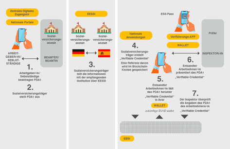 Aufbauend auf diesen Erkenntnissen arbeiten gegenwärtig zwei Konsortien mit jeweils unterschiedlichen Fragestellungen an der Weiterentwicklung der „wallet“. Im Bereich der sozialen Sicherheit soll nun konkret die digitale Umsetzung des A1-Verfahrens und der EHIC vorbereitet werden. Beim größeren Projekt „Digital Credentials for Europe (DC4EU)“ sind 80 Organisationen aus 20 Mitgliedstaaten plus Norwegen und die Ukraine beteiligt, bei „Verifiable Credentials and Trusted Organisations Registries (VECTOR) sind es 50 Partner aus ebenfalls 20 Ländern. Von der deutschen Sozialversicherung bringen sich der GKV-Spitzenverband und die Deutsche Rentenversicherung Bund Bund ein. Als ein erster Meilenstein sollen bis Ende des Jahres Geschäftspläne entwickelt werden, welche die jeweiligen Prozesse von der Beantragung bis zur Verifikation im EU-Ausland in jedem Land abbilden. Das allein ist angesichts der Verschiedenheit der Länder mit ihren zum Teil sehr ausdifferenzierten Strukturen ein sehr komplexes Unterfangen. Parallel hierzu sollen auch bereits die Grundlagen für den zweiten Meilenstein, das „Onboarding“ der Sozialversicherungsträger sowie der beteiligten Behörden und Gesundheitseinrichtungen gelegt werden.