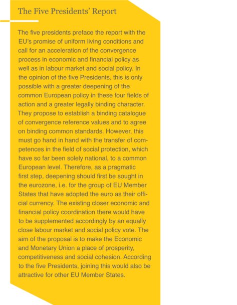 Thus, EU policy focused again on economic and financial policy. Not least because of the Greek debt crisis. Europe was once again put to the test and the Economic and Monetary Union (EMU) was called into question. Polls again showed a decline in support for the EU. This was reason enough for the five presidents of the European institutions (European Commission, European Council, Eurogroup, European Central Bank and European Parliament) to come together and draw up proposals to strengthen the Economic and Monetary Union in the long term.